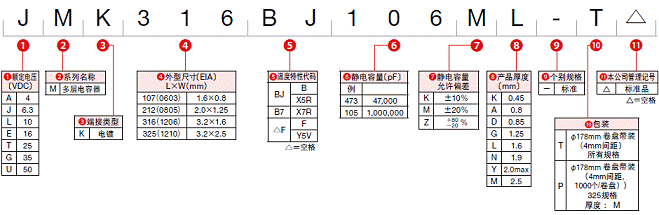 多层陶瓷 尺寸 介质 容量 精度 电压 厚度 镀层 产品编码 特殊代码 包装码 尺寸: 材料: